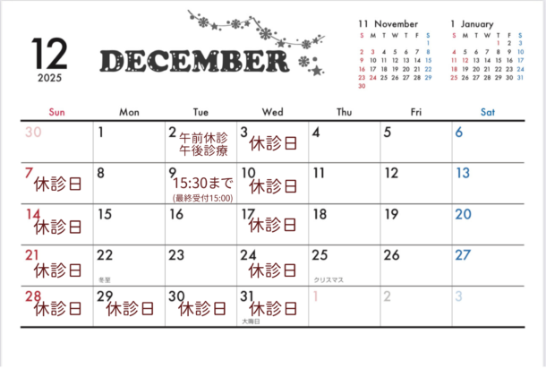 ★12月2日(火)の午前は院内ミーティングのため休診いたします。午後は通常診療いたします。